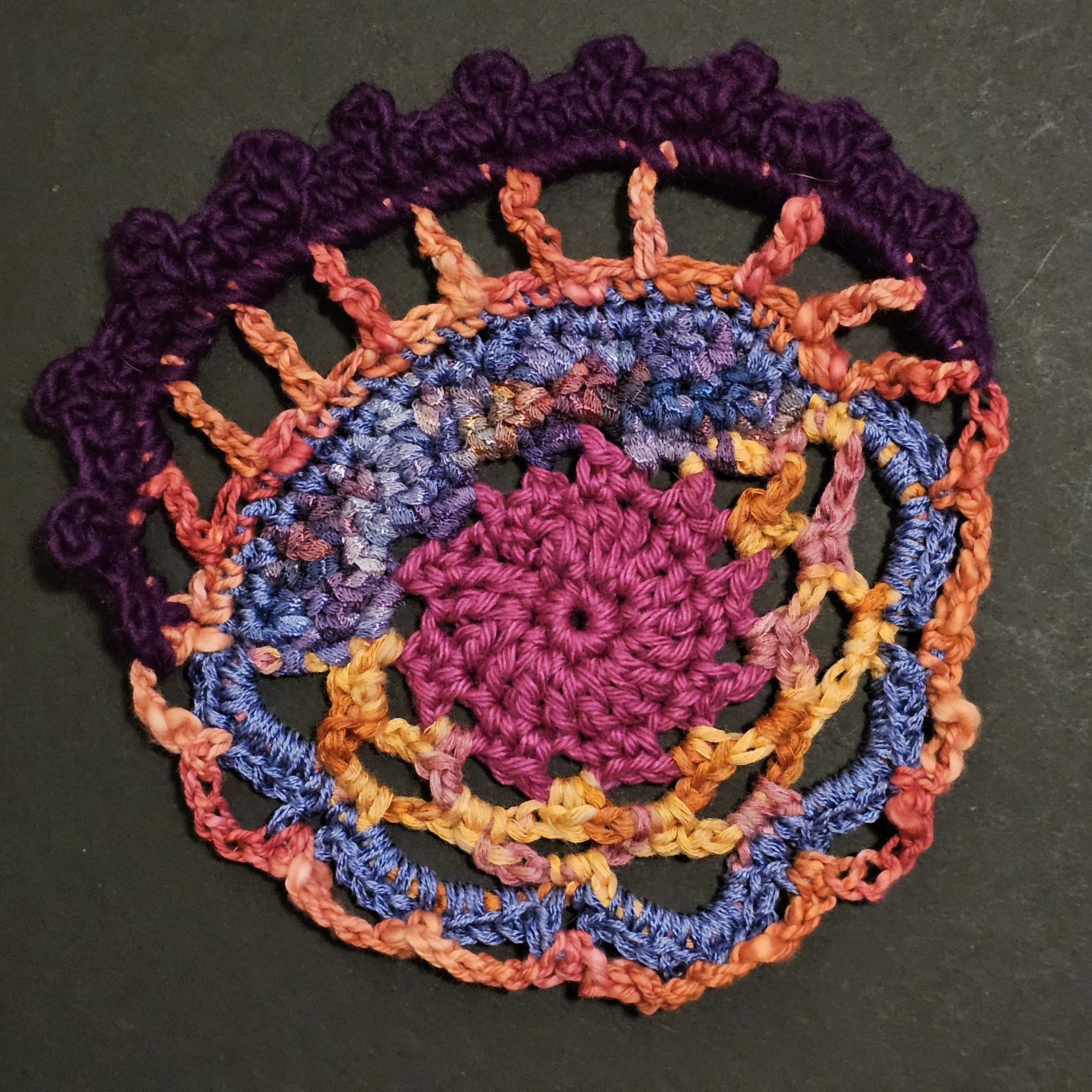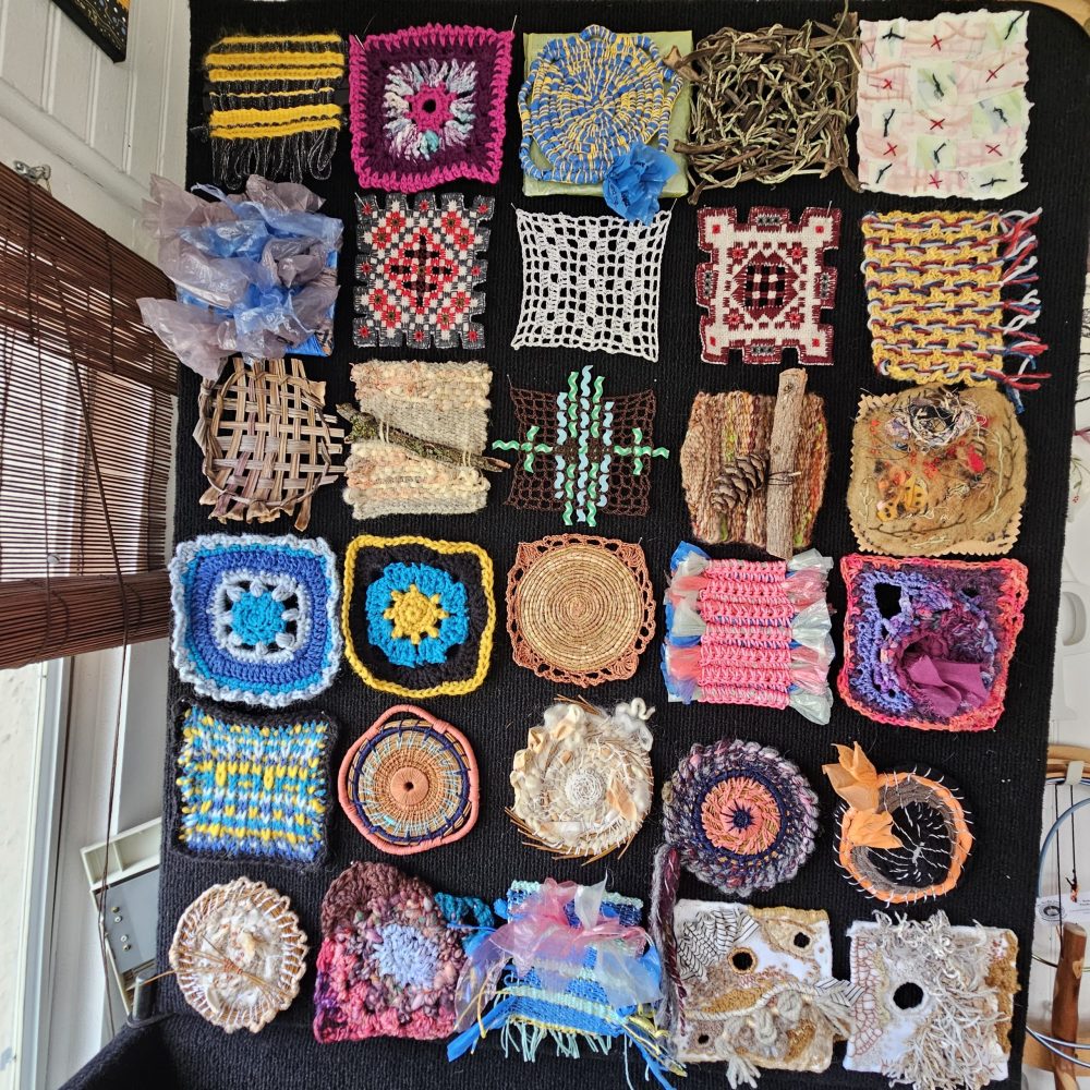 I limited myself at the start of the 100 Day Project by working within a 5"x 5" size for the textile art pieces that I worked on as a daily art practice. I explored crochet, weaving, basketry techniques, hardanger embroidery and with this work I played with random stitching and texture. Here are some of the pieces I did during the 100 Day Project from February to June 2024:
