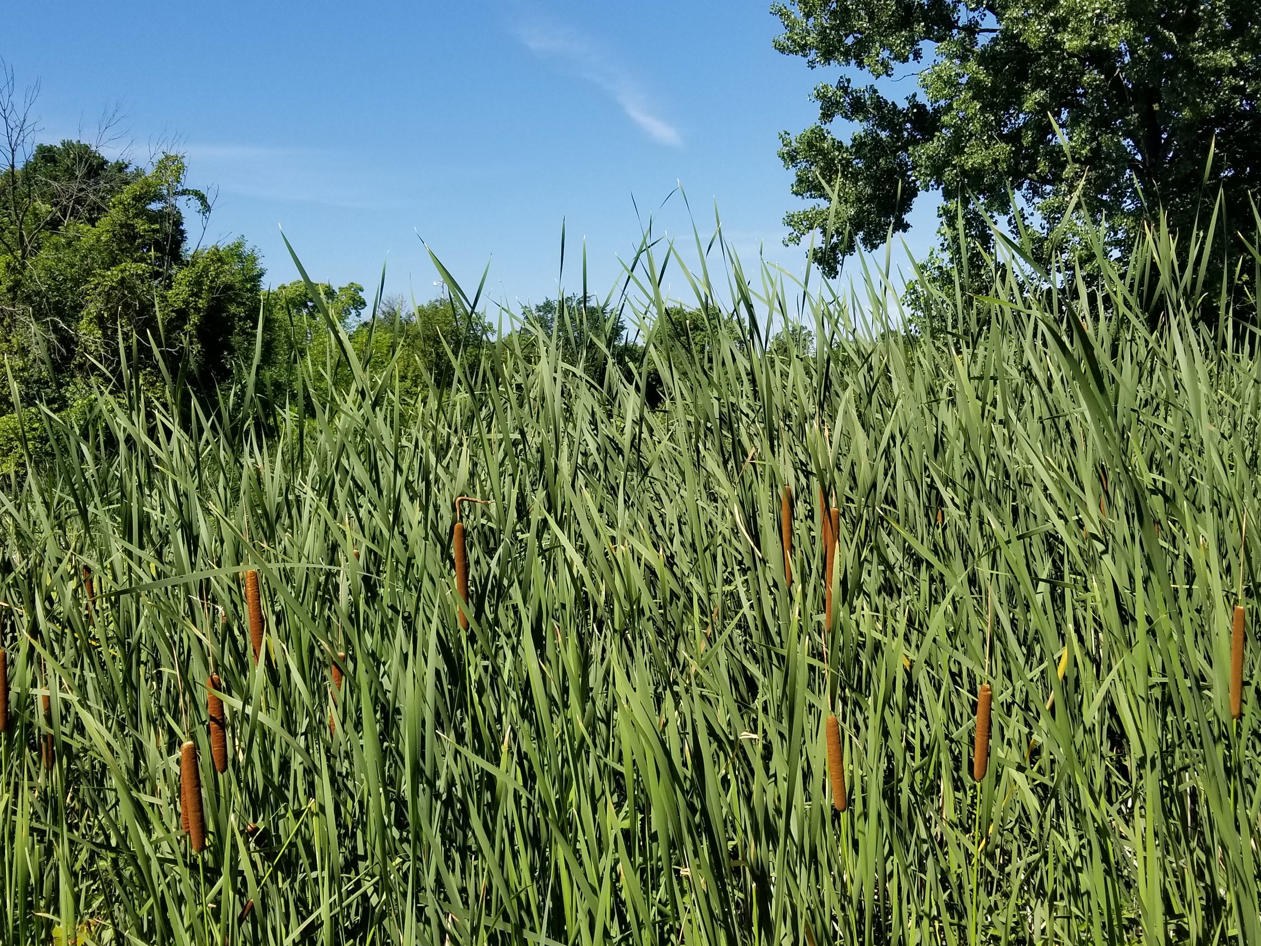 ○ Took a break for a golf outing this morning with my husband and son. More orange (balls) and (on the) green! Also, took this photo of cattails at the 8th tee. It may be a future tapestry inspiration.