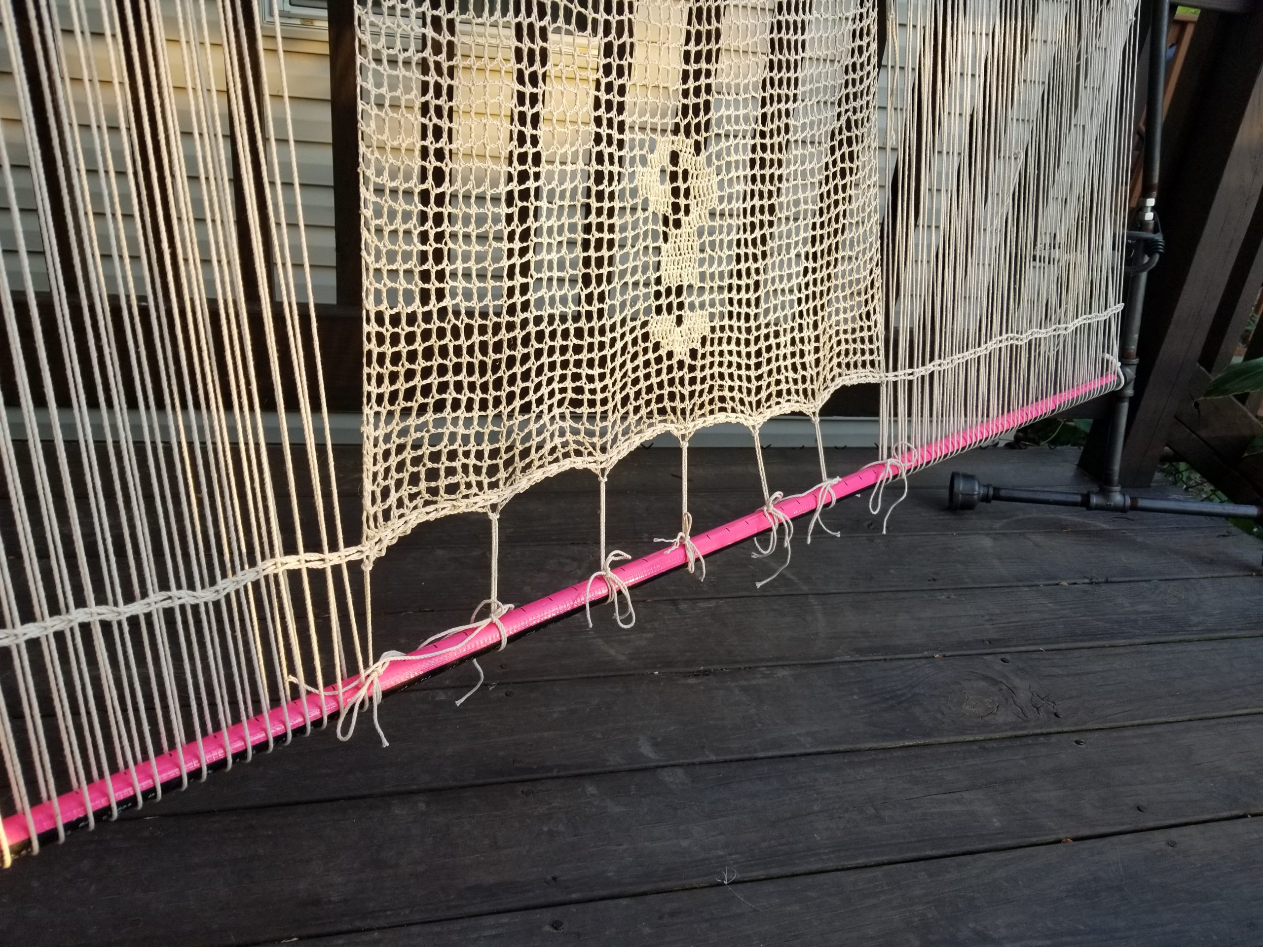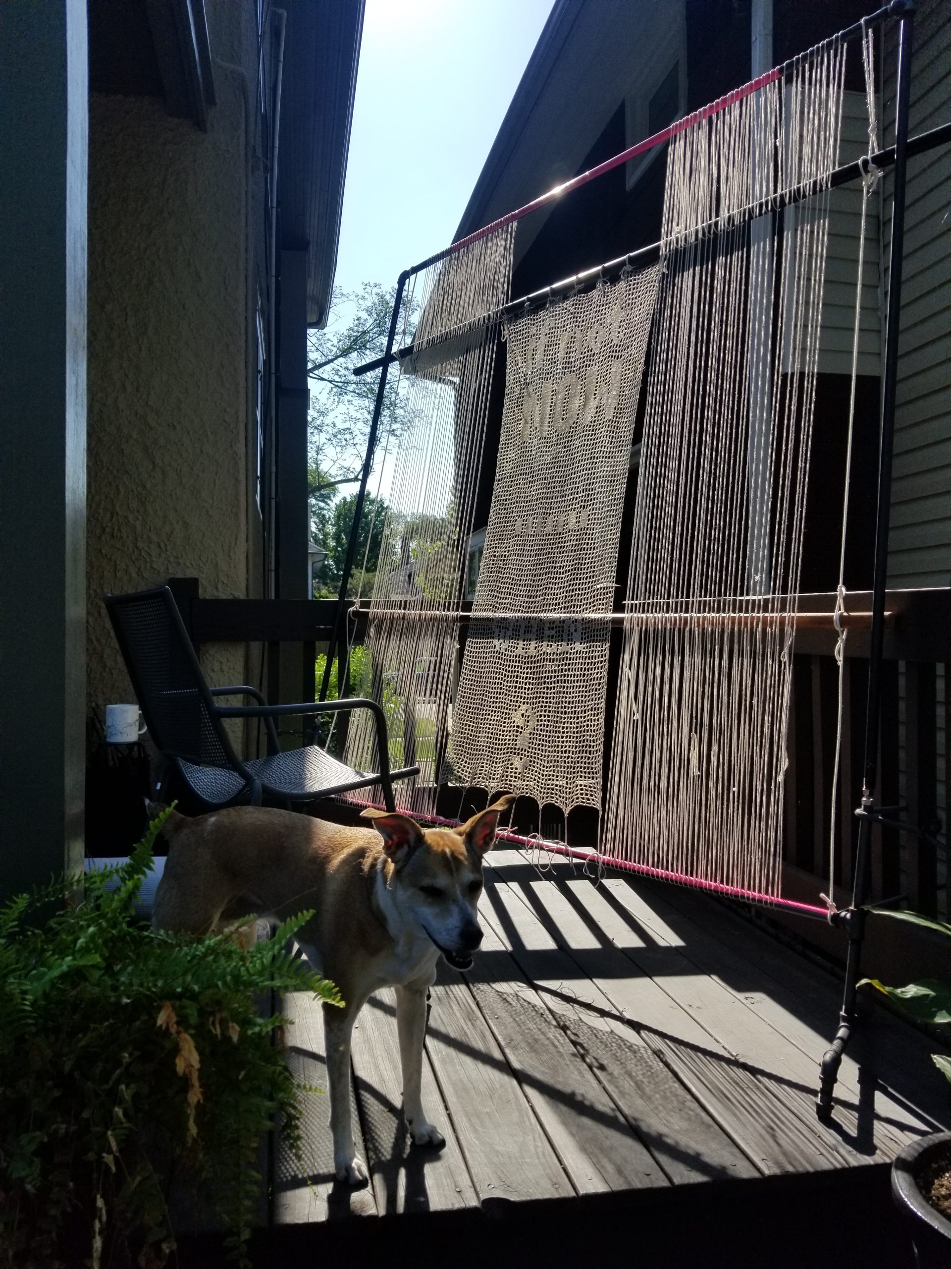 ○ My next door neighbor called me mid-day (yes on the phone, remember getting real calls?) She just wanted to say she loves living next to me! She’s enjoying watching me “looming” outside her window. I was worried she might think I’m peeping, even though there are curtains. She can’t wait to watch my weaving progress. You can see how close my loom is to her window!