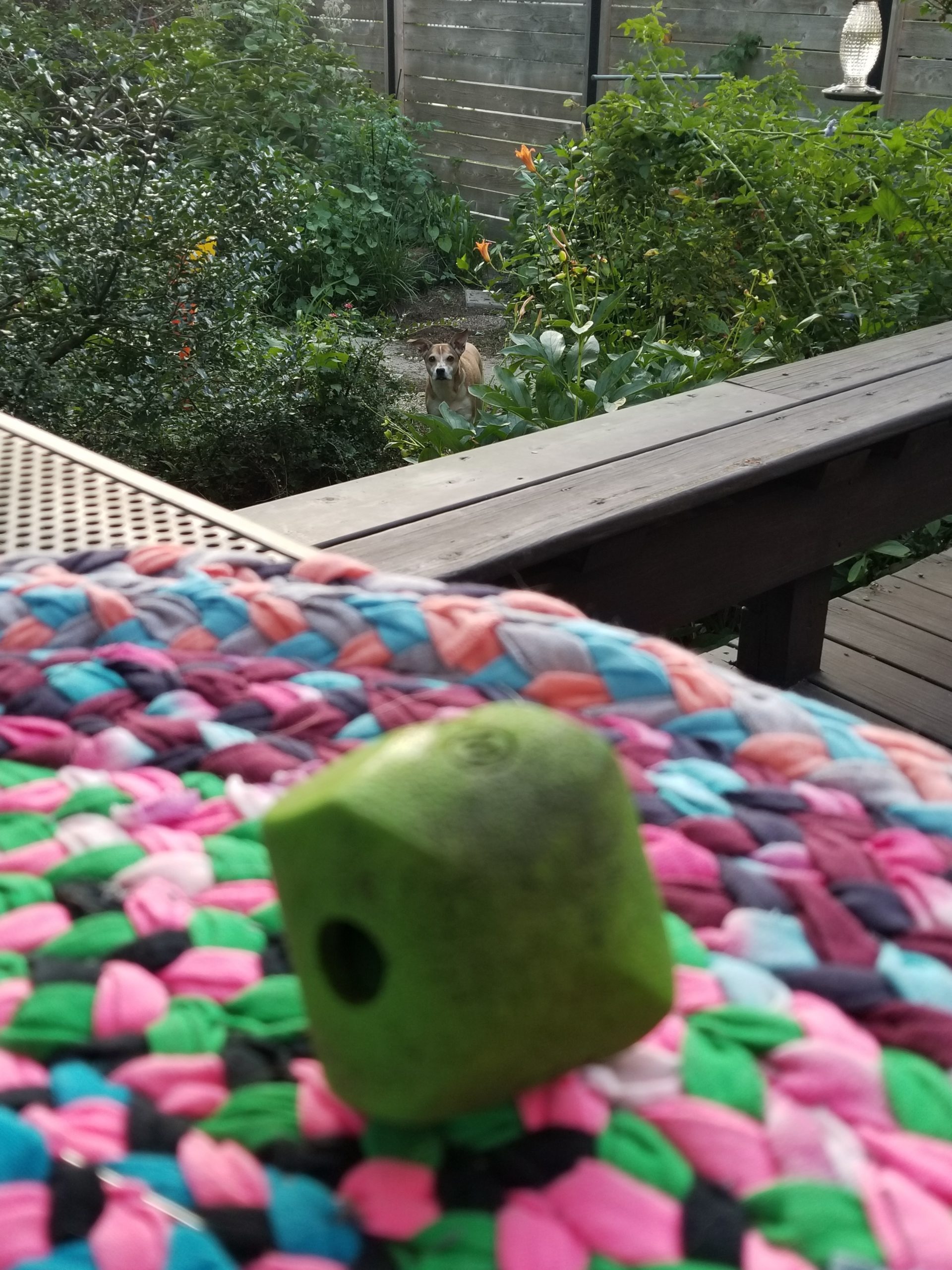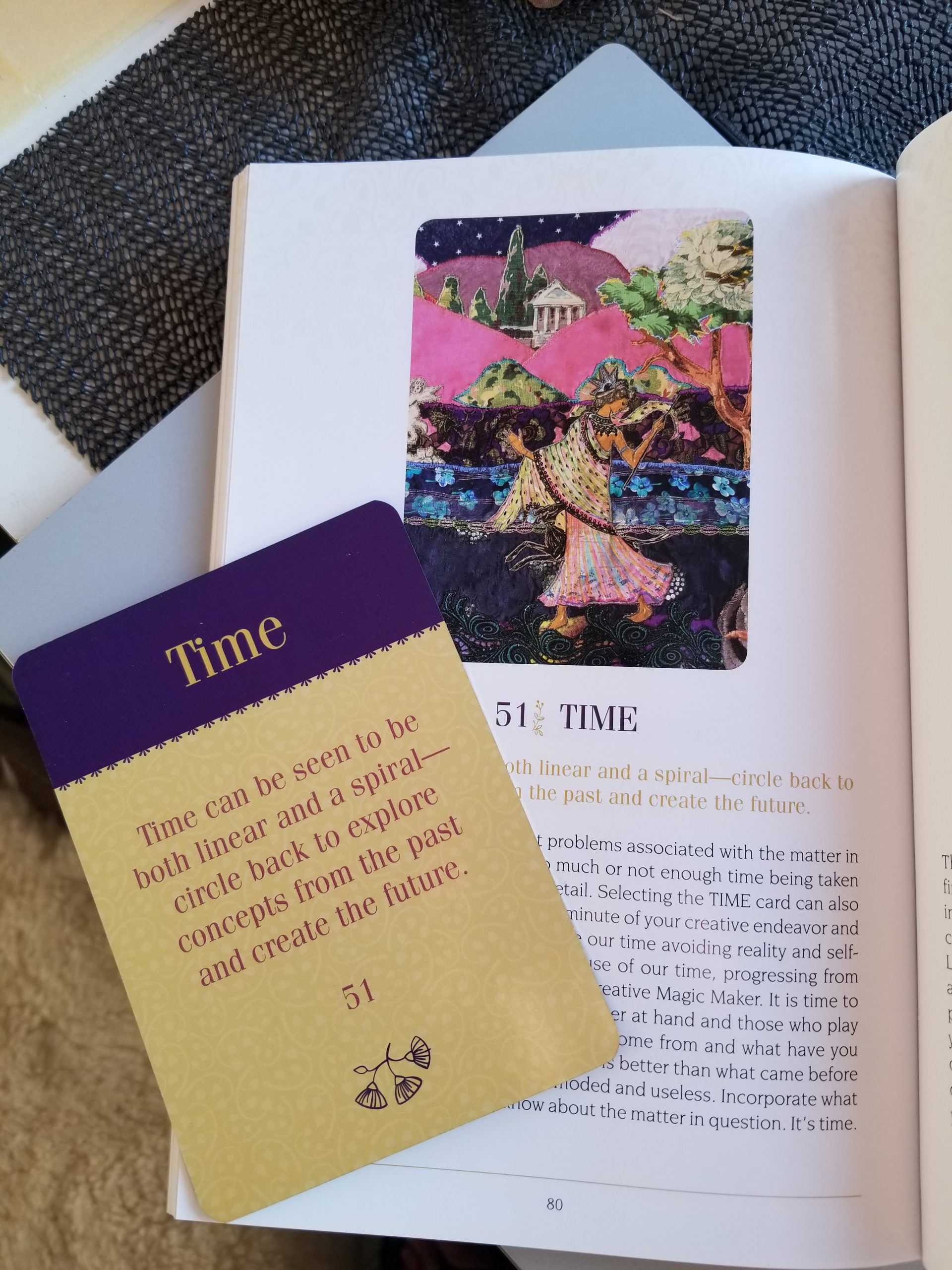○ Beautiful weather today, I want to keep stitching on this rug out here on the deck, but Fiona would rather I stop and play some ball with her (can you see her peeking through the bushes?) Creativity Oracle: TIME Seems like a perfect message today as I combine my older work (WHEN?) into me current project. “Circle back to explore concepts from the past and create the future.”