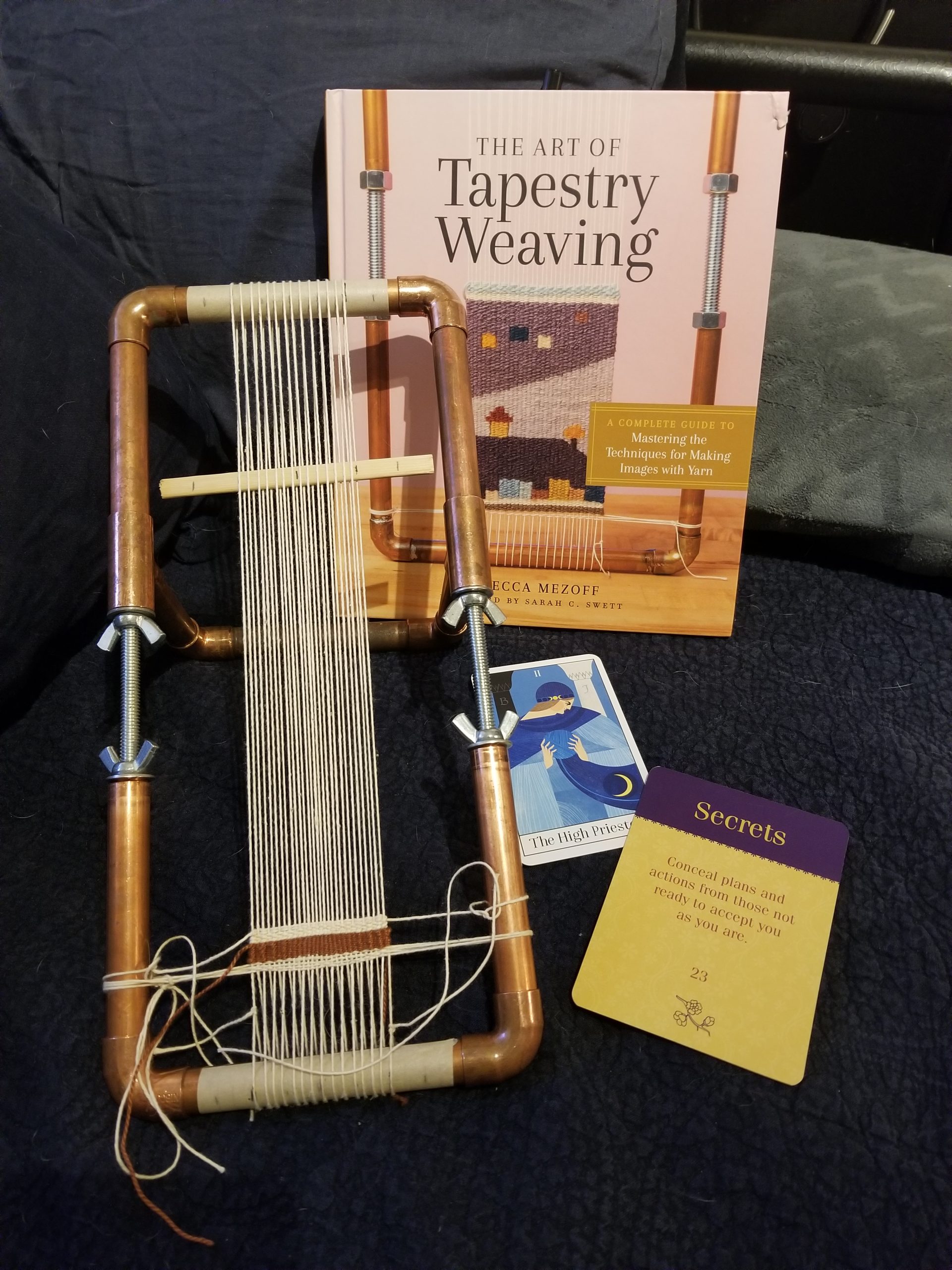 ○ Set up my little copper loom and collected my travel weaving supplies for the “Summer of Tapestry ” course with @rebeccamezofftapestry