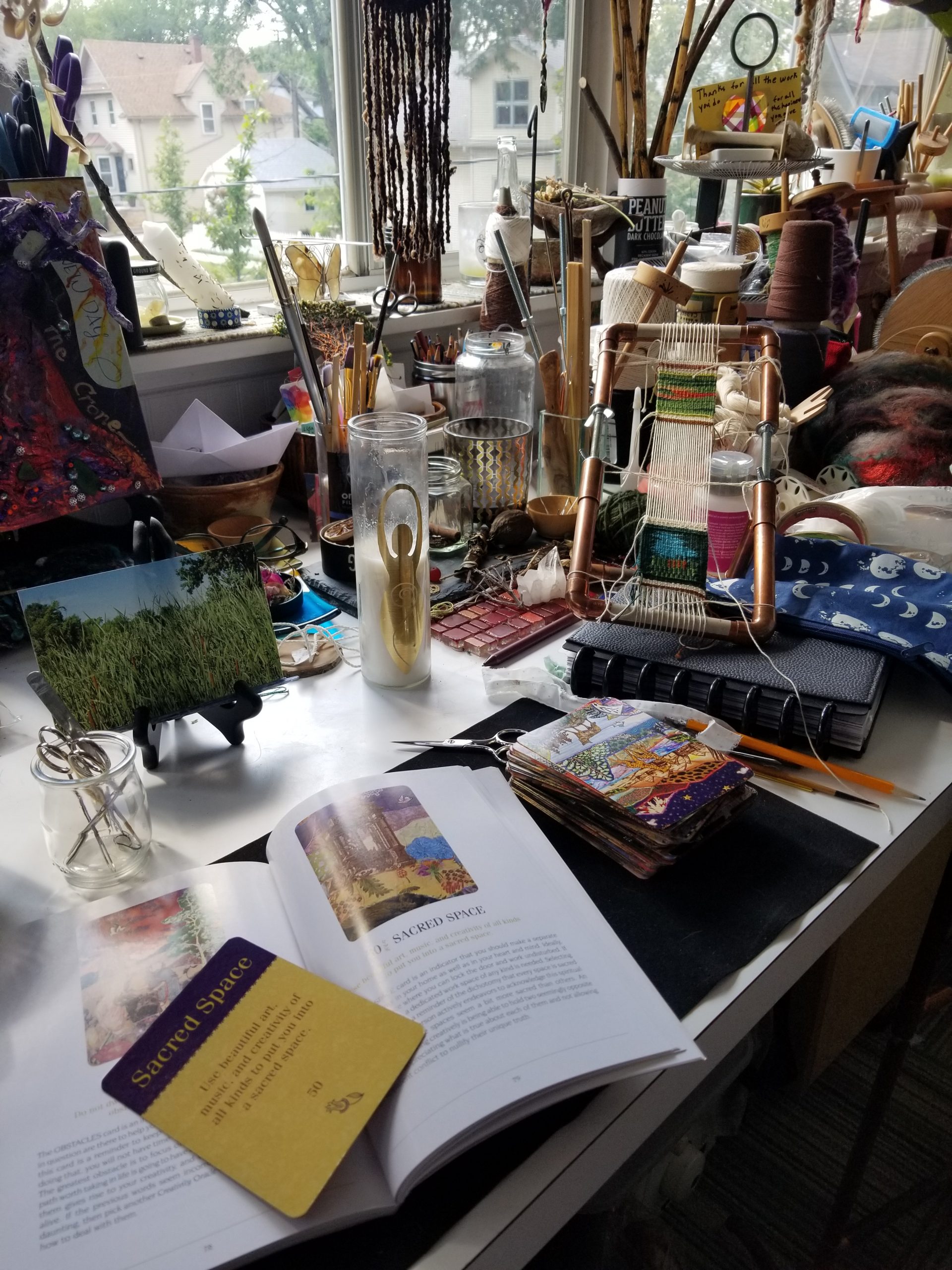 ○ My Creativity Oracle card today is “Sacred Space”. It prompts me to devote space for my creative activities. And while it’s rather cluttered right now, my little studio is devoted to my endeavors. It also states that wherever we create is “sacred”. I couldn’t agree more. I was able to spend some time early in the day on a bit more twining on my large loom weaving. But as the morning sun moved over my head it was a hotter and more humid day and I had to move into the studio. So, not much more there to see yet.